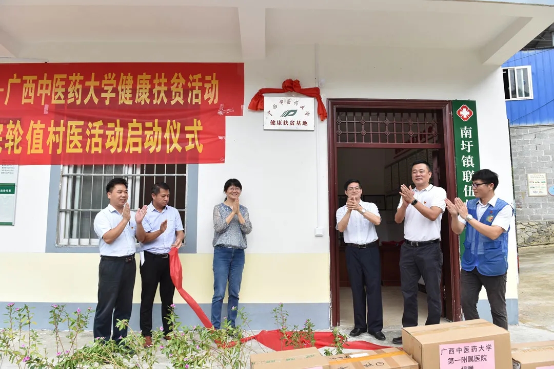9月11日上午,YABO鸭脖健康扶贫基地揭牌仪式暨YABO鸭脖第一附属医院“轮值村医”活动启动仪式在定点扶贫村隆安县南圩镇联伍村举行。YABO鸭脖党委副书记何并文和学校有关处室领导,YABO鸭脖第一附属医院党委书记桂雄斌和相关科室负责人、专科专家团队一行,到联伍村参加启动仪式。