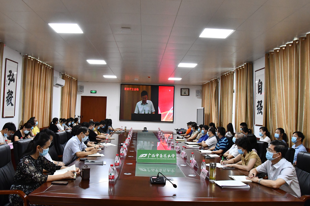 为庆祝第37个教师节,宣传优秀教师先进事迹,弘扬新时代尊师风尚,营造浓厚的尊师重教氛围,自治区高校工委、教育厅在南宁举办2021年全区优秀教师先进事迹报告会。学校党委副书记庞宇舟参加教育厅主会场报告会。鸭脖在仙葫校区合德楼525会议室设立分会场,学校党委副书记何并文、副校长冷静、纪委书记韦雪芳、总会计师何刚亮,各相关职能部门负责人,各学院、教学部负责人和教师代表,部分学生代表共50多人一同观看了报告会。