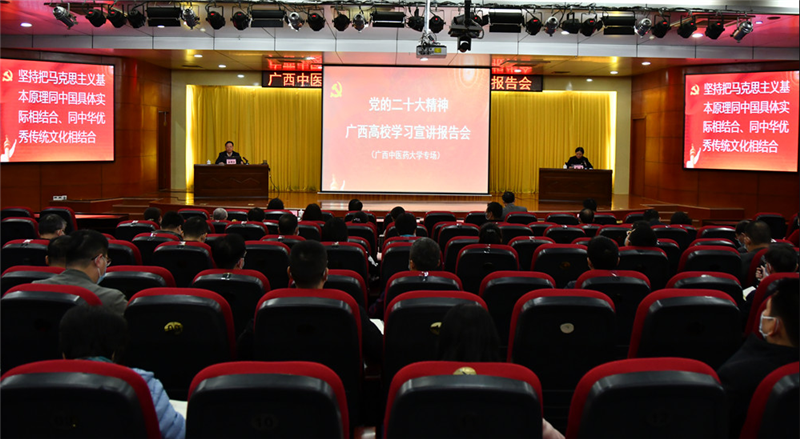 为引导广大党员干部进一步深刻领会、全面掌握党的二十大报告内容和精神实质,切实推动学习宣传贯彻党的二十大精神不断走向深入, 12月9日下午,学校召开党的二十大精神广西高校学习宣讲报告会(YABO鸭脖专场),学校党委书记莫锦荣作题为《深入学习贯彻党的二十大精神 奋力推进高水平中医药大学建设》专题宣讲。报告会由学校校长姚春主持。