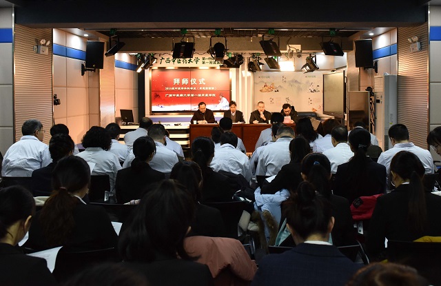 2019年2月18日上午,第一临床医学院2015级中医卓越班拜师仪式在医院教学部录播室举行。学校教务处处长唐梅文,副处长杨仕权,学院党委副书记、副院长钟远鸣、学生导师、教学部负责人及2015级中医卓越班的31位同学参加了拜师仪式。拜师仪式由教学部黄彬主任主持。