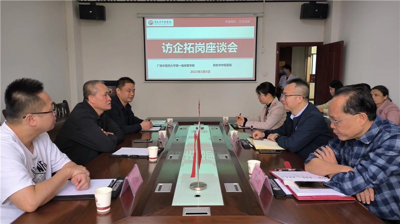 就业就是民生,也是大学人才培养质量的考核指标之一。为了促进2023届毕业生就业,了解学院近几年毕业学生的培养质量,掌握用人单位对医学生人才的需求,进一步完善和修订学院人才培养方案,培养适应市场和用人单位需求的优秀医学生,拓展学生就业岗位,探索学生毕业后的继续教育合作形式,学院与百色市中医医院领导班子、相关职能部门、临床科室主任进行了走访、调研、座谈。