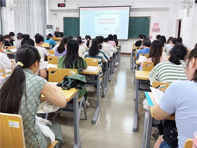 5月22日上午,YABO鸭脖第一临床医学院于明秀校区时珍楼召开2024届毕业生实习动员大会。第一临床医学院党委副书记、副院长钟远鸣,教务处实习管理科科长程若敏,学院教学党总支书记罗之瑜,各班辅导员及2023年全体实习生共670多人参加了本次实习动员大会。