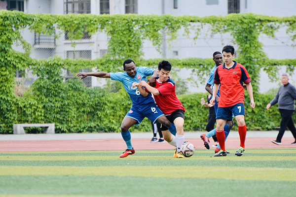 5月9日,为了加强鸭脖留学生与中国学生的体育文化交流,留学生足球队与校足球队在仙葫校区足球场举行了一场激动人心的足球友谊赛。国教院学工办陈斌主任和阳蓝田老师出席观看了比赛,为我院队员助威。