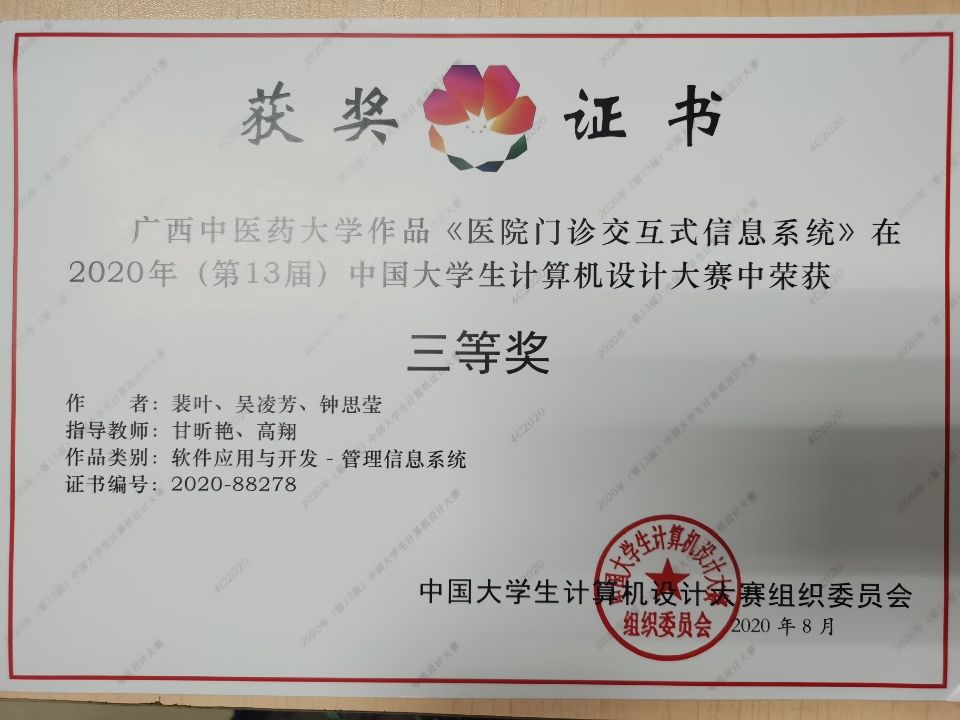 “中国大学生计算机设计大赛”(简称大赛)的宗旨是全面提高本科教学质量,切实提高计算机基础教学水平,激励大学生学习计算机知识、技术、技能的兴趣和潜能, 2020 年(第 13 届)中国大学生计算机设计大赛由中国大学生计算机设计大赛组织委员会主办,是国家官网公布的全国大学学科竞赛排行榜上的赛事之一。鸭脖公共卫生与管理学院信息技术系积极组织学生参加比赛, 2017 级信息管理与信息系统专业学生裴叶、吴凌芳和钟思莹团队,在本次大赛中获得三等奖,进一步展示了鸭脖学子的风采。