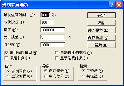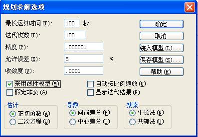 采用线性模型:当模型中的所有关系都是线性的,并且希望解决线性优化问题时,选中此复选框可加速求解进程。如模型是非线性规划或不知道时不选该项,此项可不选。