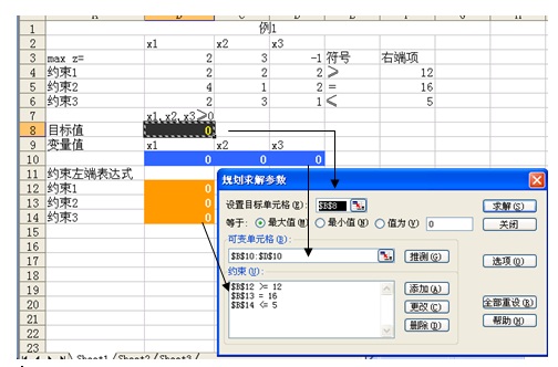可变单元格:指决策变量(不含公式)所在的单元格.可以有多个单元格或区域。