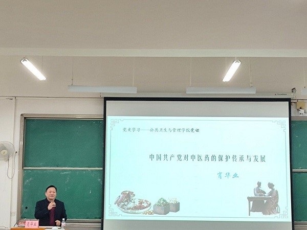 为进一步加强党史学习教育,使我院学生了解中医药的发展史,2021年11月9日下午,公共卫生与管理学院邀请到了鸭脖招生与就业处处长肖华业,以“中国共产党对中医药的保护传承与发展”为主题,给我院学生支部开展主题党课教育。我院学生第一党支部书记宋南、学生第二党支部书记鲁蕴律、学生第三党支部书记唐梧茜、学院所有学生支部党员、入党积极分子及递交了入党申请书的同学约200人参加了学习。