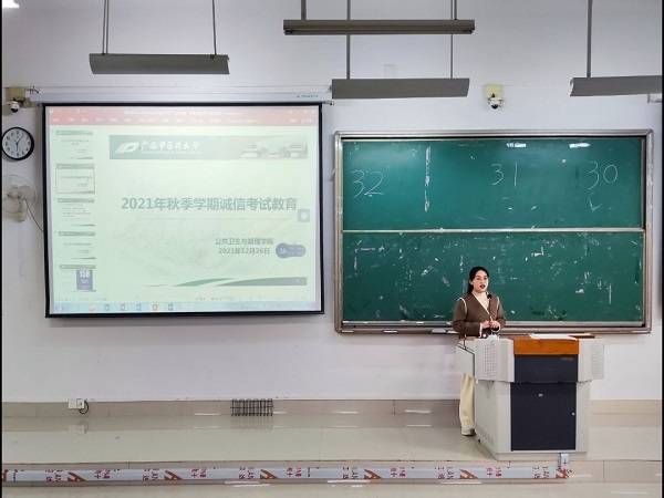 为引导同学们在期末考试中诚实守纪,做好元旦假前安全教育,公共卫生与管理学院分别于2021年12月26日18:00和18:30在仙葫校区教学楼1-201召开了2场诚信考试教育暨元旦假前安全教育会。会议由辅导员唐梧茜主持,2021级健康服务管理专业、信息管理与信息系统专业学生131人及2020级全体同学238人分别参加了会议。