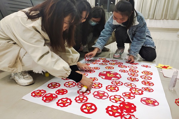 活动伊始,学生第一党支部书记宋南和学生第二党支部书记鲁蕴律为大家示范党徽和窗花的剪纸技巧,随后由同学们动手绘画设计和剪纸。现场气氛热烈,欢声笑语,党员们用巧手和热情完成了一张张剪纸作品。最后,党员们将制作好的党徽剪纸张贴起来进行展示并合影留念。