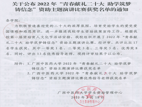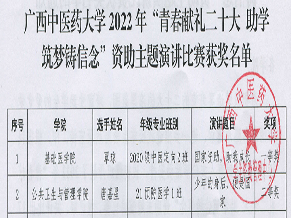 我院学子在校资助主题演讲比赛中获奖 来源:公共卫生与管理学院学生工作办公室 作者:宋南 发布时间:2022-06-04 11:46:36 浏览次数: 次 【字体:小 大】 在鸭脖第一届资助育人文化节活动主题演讲中,我院2021级预防医学院专业唐嘉星获得二等奖第一名,被学校推荐参加自治区演讲比赛。 分享到: 【打印正文】