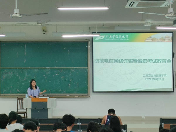 为提高我院学生防范电信网络诈骗意识,提升反诈能力,同时教育引导同学们在期末考试中诚信考试,唐梧茜于2022年6月12日18:00和18:50在仙葫校区教学楼1-201召开2场防范电信网络诈骗暨诚信考试教育会。会议由辅导员唐梧茜主持,2020级各班学生233人及2021级健康服务管理专业、信息管理与信息系统专业学生128人分别参加了会议。