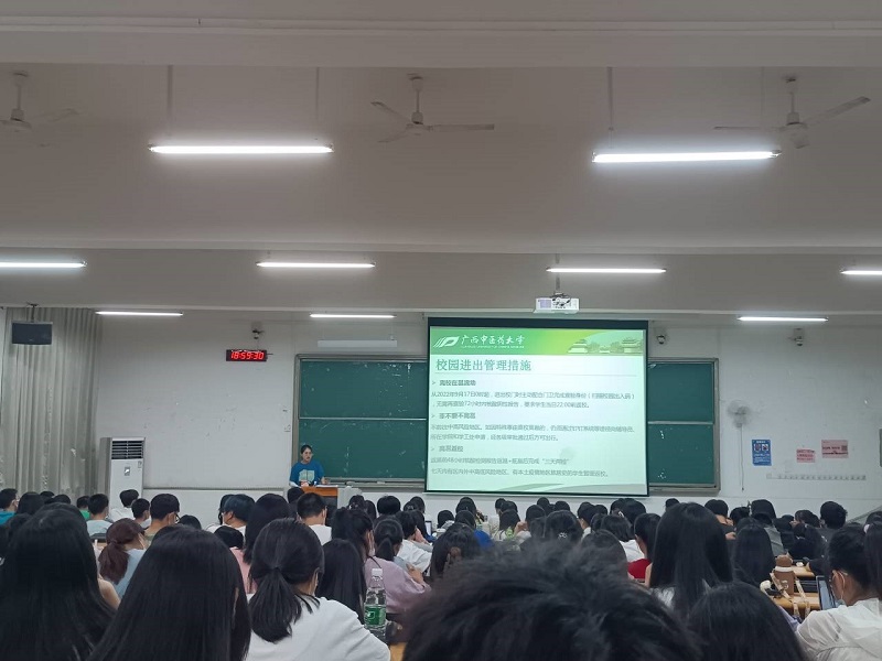 首先,唐梧茜结合近期自身经历及校内外同学们危险行径做了具体分析和反面警醒,希望同学们始终保持对自身安全的重视。其次,唐梧茜重点强调了当前校园进出管理“离校在邕流动”、“非必要不离邕”、“离邕返校”的具体要求。接着,唐梧茜针对家庭经济困难学生认定工作的常见问题展开答疑,分别解答了“如何填写表格”“需要何种证明材料”“是否申请困难认定”等问题。最后,唐梧茜分别对两个年级的学生寄予了新学期的期望,希望2020级学生珍惜最后一年在校上课时光,尽快找到未来个人发展的定位和轨道,提前谋划做好准备;希望2021级各班级加强学风班风,提升自律、紧抓学业、迎头赶上。