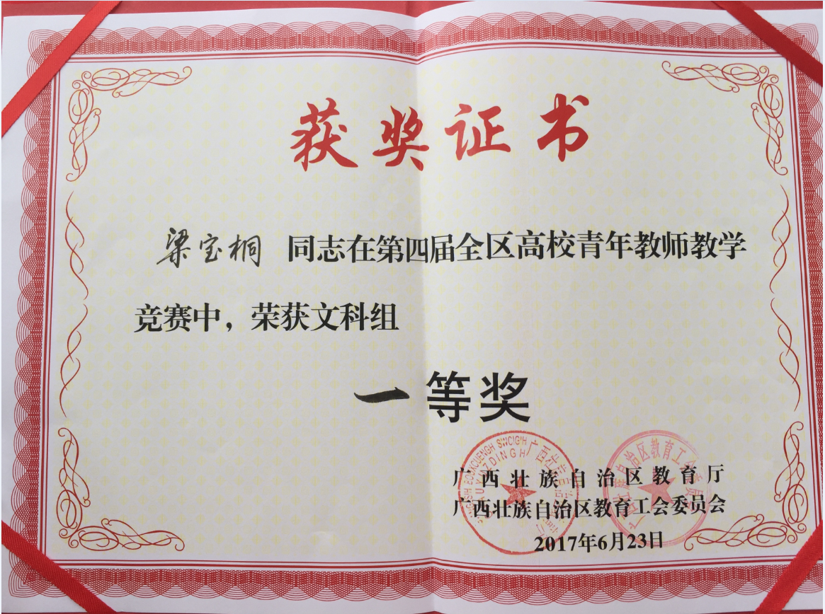 6月21日~23日,第四届全区高校青年教师教学竞赛在广西师范大学举行,公共卫生与管理学院选派的梁宝桐老师在全区36所本科院校(含独立学院)的110名青年教师中脱颖而出,荣获文科组一等奖,这也是鸭脖选派的文科组教师获得的历史最好名次。