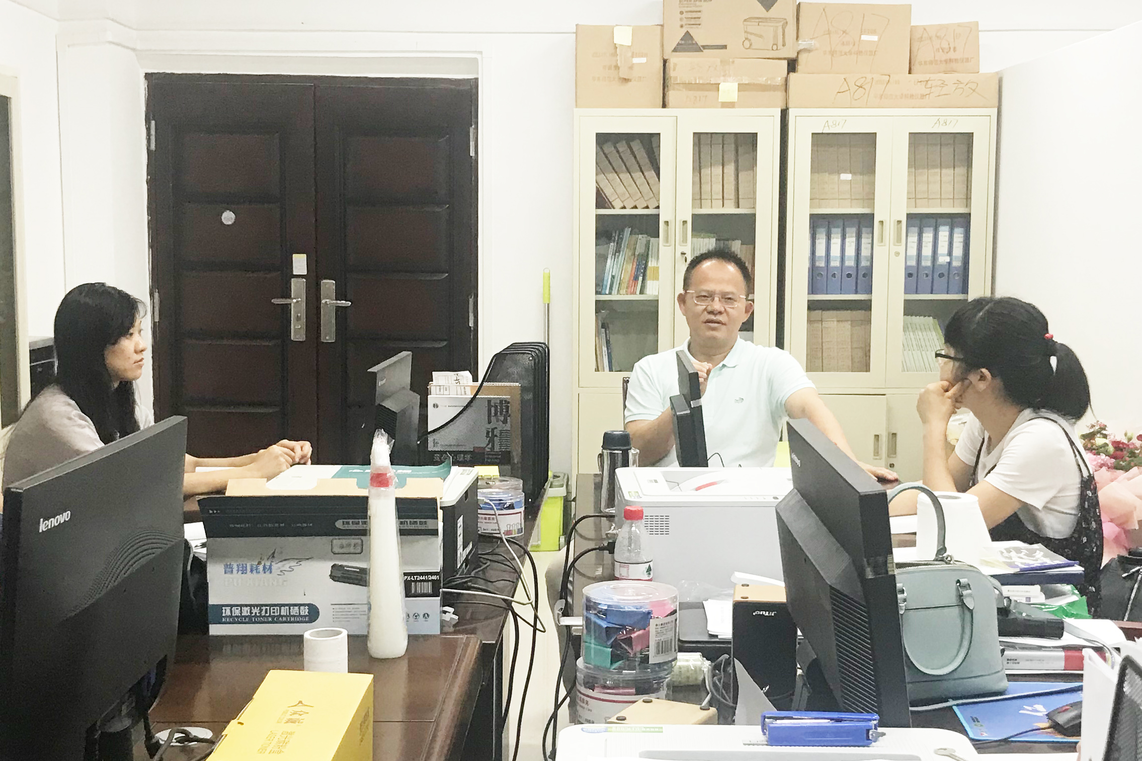 公管学院党总支书记李怀泽与教师一起学习讨论教学工作