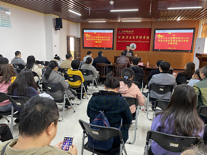 为了调动广大教师及科研人员申报国家自然科学基金的积极性和提高申报质量,由科技处主办、公共卫生与管理学院承办国家自然科学基金项目申报专题讲座,1月14日下午在自诚楼A801会议室举办。讲座邀请了广西医科大学叶力教授和蒋俊俊教授与鸭脖教师交流申报国家自然科学基金的一些心得体会。讲座由公共卫生与管理学院副院长李海博士主持,科技处肖健处长出席了讲座,鸭脖广大教师聆听了讲座。两位教授的讲座给我院广大教师很大的启发,为申报2021年国家自然科学基金提供很多信息和思路。