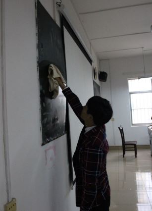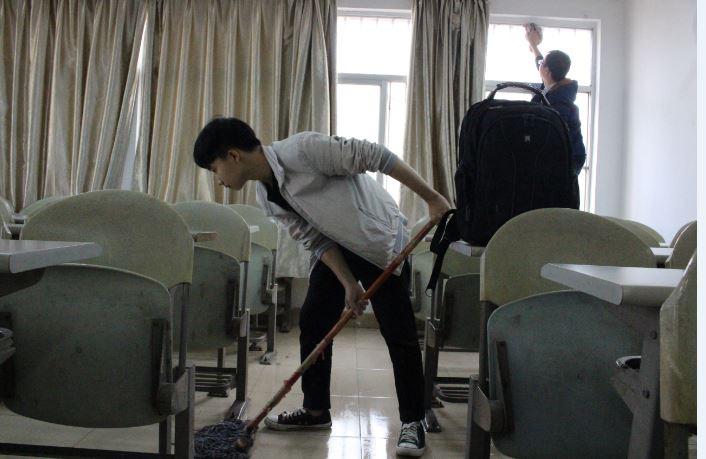 骨伤学院团委学生会的成员们首先在指定好的地点进行集合,然后有组织、有纪律的向目的地教学楼走去,到达教学楼之后,他们很快便行动起来,纷纷拿着扫把、抹布、拖把积极的往各个教室走去,一个个就像校园的清洁小卫士。
