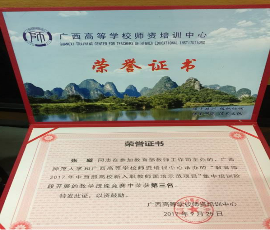 秋风滋起,余热仍存,2017年9月6日至2017年9月26日,国家中西部高校新入职教师培训在漓江畔的广西师范大学育才校区举办,本次培训由教育部教师工作司主办,广西师范大学和广西高等学校师资培训中心承办,在培训过程中,YABO鸭脖骨伤学院张璇老师脱颖而出,荣获教学技能竞赛第三名。