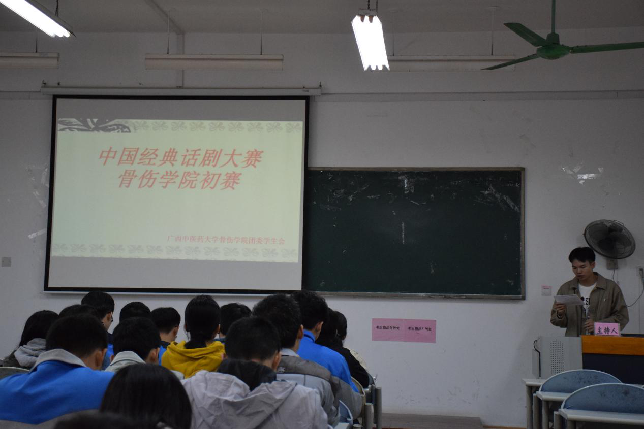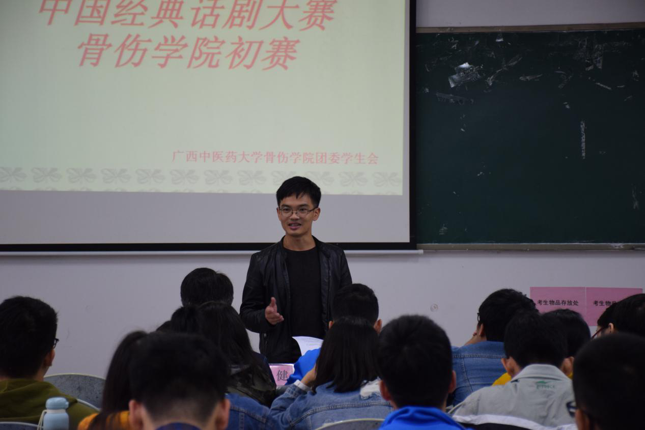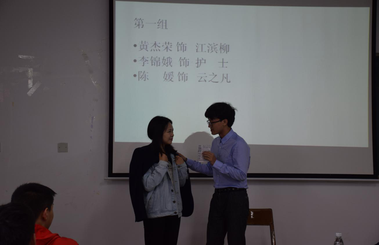 中国经典话剧大赛骨伤学院初赛于10月17日中午在明秀校区新西一教室举行,骨伤学院团委书记温健老师 作为嘉宾莅临大赛现场,并有幸邀请到 戏剧协会 成员担任评委 。 经过前期的精力准备工作,共有四组演员报名参加此次初赛, 演员在表演时 同力协作, 配合默契 , 为现场观众重现了 《暗恋桃花源》的经典 画面 ,让观众领略到经典话剧的 迷人 魅力, 不禁 沉醉在演员的表演当中,流连忘返。