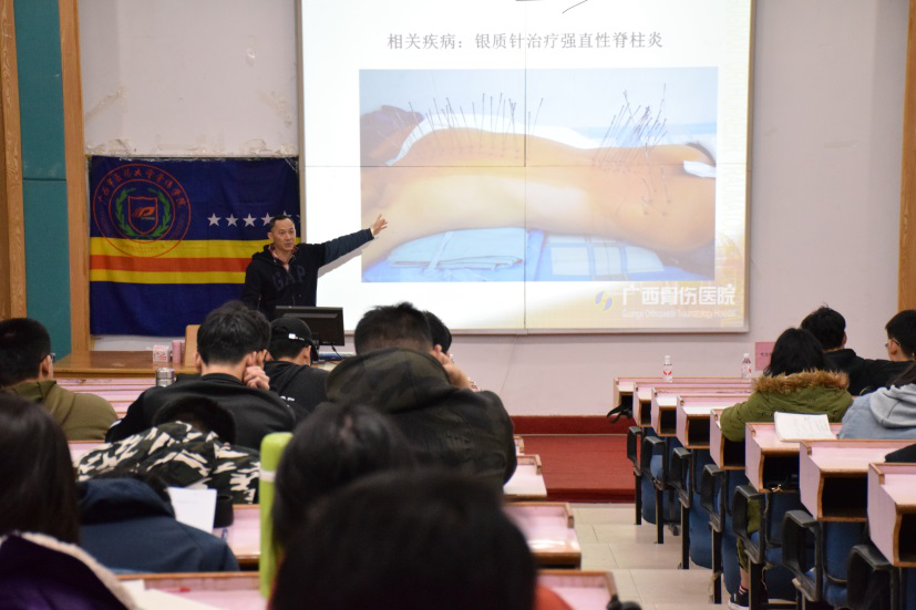 2019年3月24日19:30 , YABO鸭脖明秀校区西梯一教室 , 广西骨伤医院 颈椎腰腿痛科·骨伤康复科 安平 主任 给 骨伤学院师生 带来 题为 “中医瑰宝-银质针” 的 讲座 。 骨伤 学子 齐聚一堂共同聆听与探讨其中魅力,骨伤学院院长周红海 教授 , 学办主任 温健老师出席本次讲座。