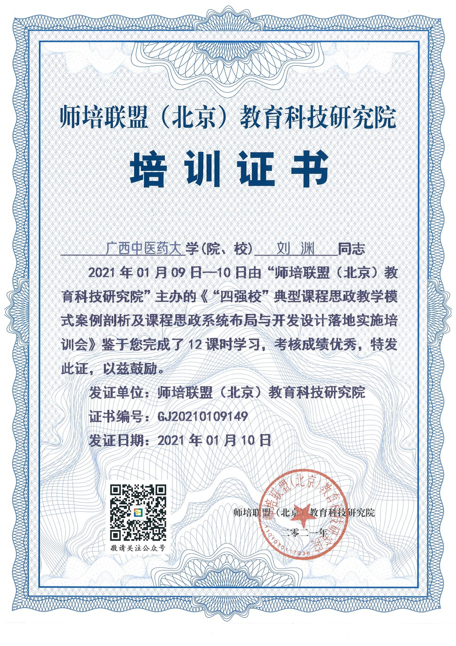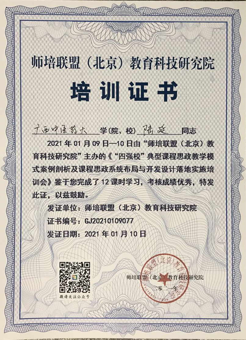 2021年1月9日-10日,YABO鸭脖骨伤学院教师刘渊副教授和陆延讲师在南宁参加了由师培联盟(北京)教育科技研究院组织的“四强校”典型课程思政教学模式案例剖析及课程思政系统布局与开发设计落地实施培训会。