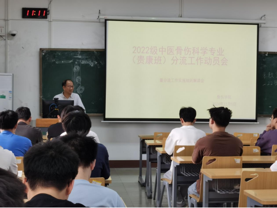 优中选优,择优录取,弘扬特色,推进教学。按照学生的人意愿、专业成绩、综合测评2022级骨伤专业将分流成中医骨伤科学贵康班和普通班。11月6,骨伤学院举办了动员大会,学院院长周红海宣读决定并作动员讲话。教师代表以及全体2022级中医骨伤科学专业的学生参加了大会。