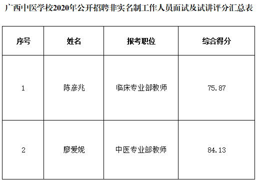 广西中医学校(YABO鸭脖附设中医学校)2020年公开招聘非实名制工作人员面试成绩及试讲成绩公告 发布时间:2020-05-25 10:11:02 浏览次数: 次 【字体:小 大】 根据《广西中医学校(YABO鸭脖附设中医学校)2020年公开招聘非实名制工作人员符合条件人员公示》,学校于2020年5月21日上午对应聘人员进行面试及试讲,现将成绩公示如下,请各位考生自行查阅。 2020年5月22日 分享到: 【打印正文】