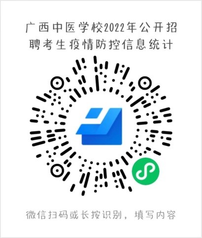 广西中医学校(YABO鸭脖附设中医学校)2022年公开招聘实名制工作人员健康管理档案报备截止时间公告 发布时间:2022-07-06 17:27:37 浏览次数: 次 【字体:小 大】 根据疫情防控要求,疫情期间,要求考生进行健康管理档案报备工作,参加2022年7月8日笔试的考生,须于2022年7月6日晚12:00前完成健康管理档案报备工作;参加2022年7月12日笔试的考生,须于2022年7月8日晚12:00前完成健康管理档案报备工作,不按要求报备的,视为自动放弃考试资格。 报备方法:微信扫下方二维码进行报备。(已经按要求报备过的考生不需要重复报备) 分享到: 【打印正文】