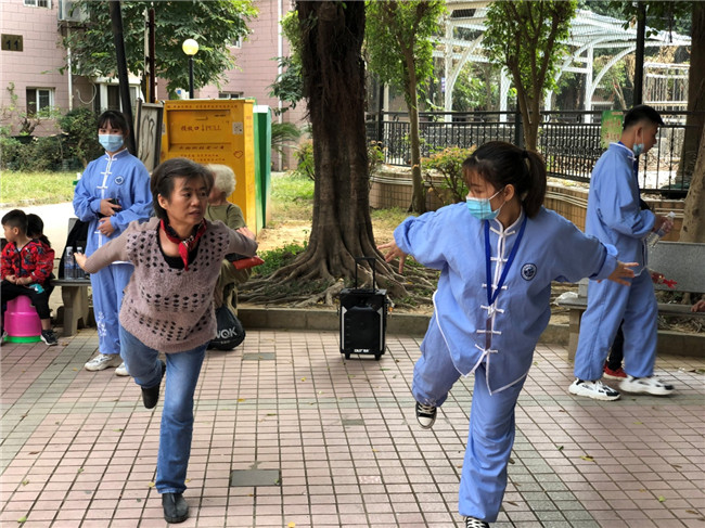 志愿者向居民传授强身保健功法