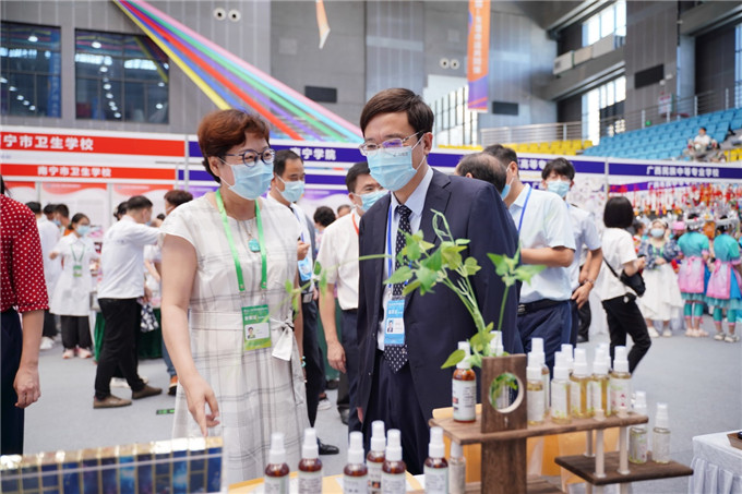 2021年9月27日-28日,自治区教育厅厅长刘友谊、副厅长黄雄彪等莅临鸭脖2021中国-东盟职业教育学生技术技能展。校长刘竑清、副校长周琦简明扼要向刘友谊厅长介绍中医药特色传统技术疗法和中医药药膳等。
