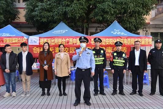 为了普及防电信网络诈骗知识,让在校学生懂得诈骗的手段和骗局。2021年11月9日上午,南宁市明秀派出所联合中国移动到鸭脖开展“防范电信网络诈骗,提升学生防范意识”主题宣传活动。