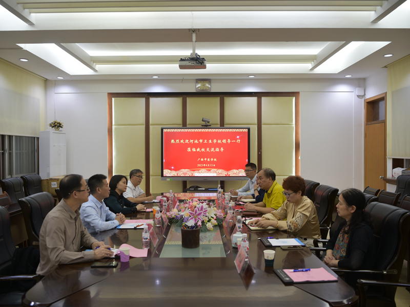 2023年4月13日下午,河池市卫生学校校长陈朝亮、副校长莫苗、教务科科长白震、招生就业办负责人黄鸿宇一行5人来访鸭脖。校长刘竑清、副校长周琦、林原及相关部门负责人热情接待了陈朝亮一行,双方在东葛校区一楼会议室进行座谈交流。