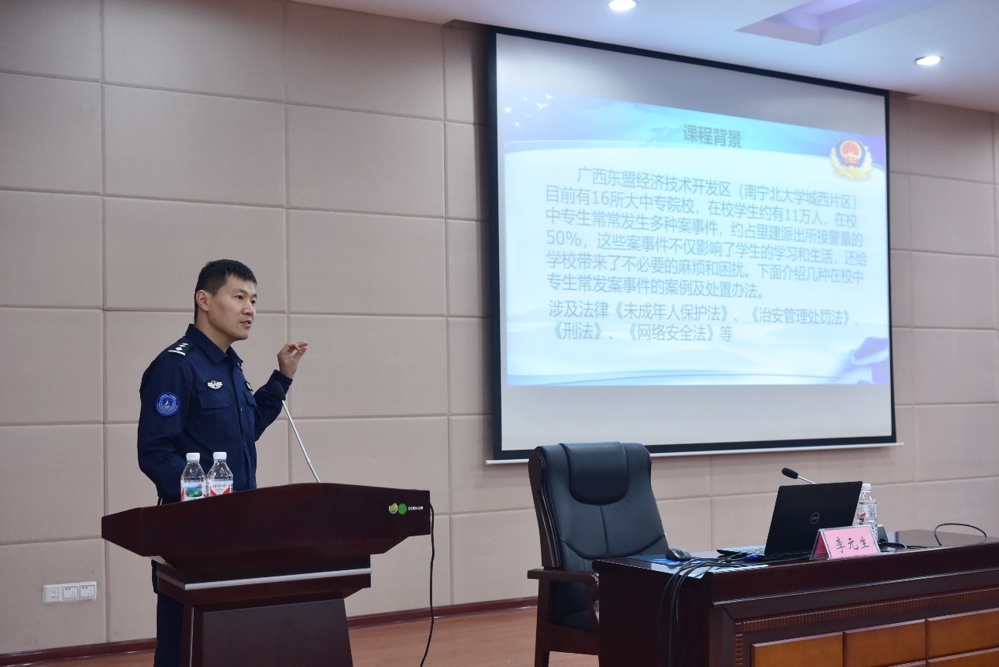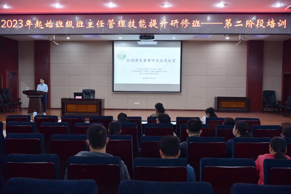 为帮助班主任在发生校园案件或者紧急突发事件时能快速正确地处置,减少或者避免校园案事件的发生,2023年12月12日下午 15:30,鸭脖“中医五行德育”班主任工作室邀请了鸭脖东盟校区辖区派出所,南宁市公安局里建派出所二级警长、东盟公安分局团支部书记、南宁市公安警校兼职教官李元生警官到鸭脖北湖校区开展了“校园常见案事件及应急处置”讲座。“中医五行德育”班主任工作室全体成员、“青盾”校园法制教育工作站成员、全体班主任、学生科老师一起参加了讲座。