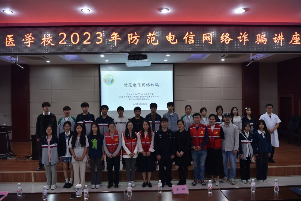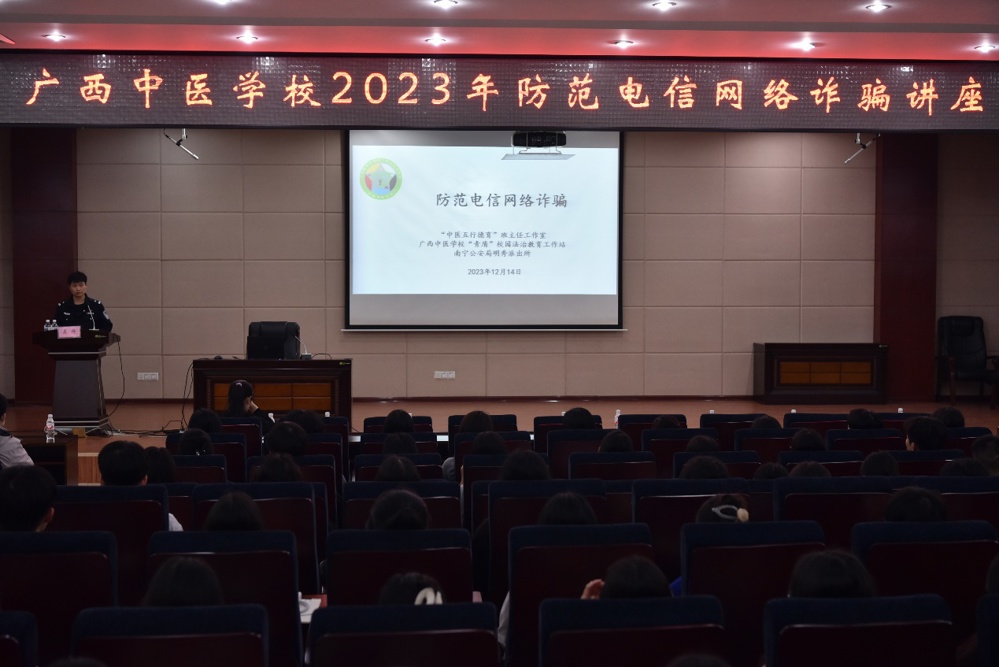 2023年12月14日晚7:00,鸭脖“中医五行德育”班主任工作室、“青盾”校园法治教育工作站联合南宁市公安局明秀派出所在北湖校区多功能厅举办了一场反诈讲座,全校270名师生代表参加。