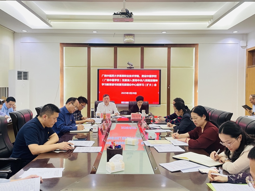 3月28日上午,高等职业技术学校、附设中医学校召开深入贯彻中央八项规定精神学习教育读书班暨党委理论学习中心组学习(扩大)会,深入学习习近平总书记关于加强党的作风建设的重要论述和深入贯彻中央八项规定精神学习教育,部署院(校)学习教育的相关工作。院(校)党委书记林原,党委副书记、院(校)长马秋平,党委副书记邓刚,副院(校)长韦文朗、黄勇,纪委书记谭丽云,全体中层干部以及党支部书记参加会议。会议由林原主持。