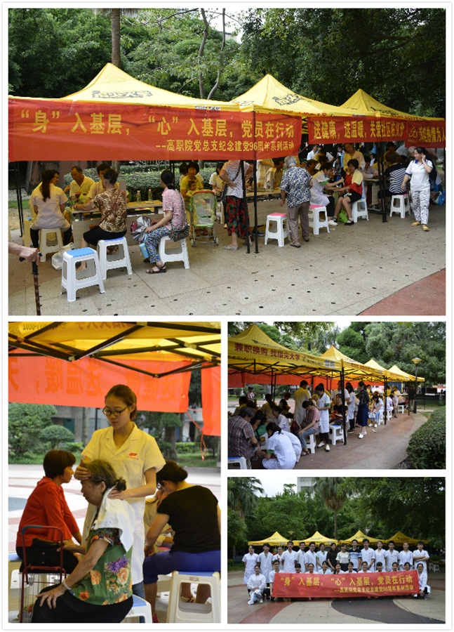 三是开展“身入基层,心入基层,党员在行动”社区义诊活动。由高职院(校)党员代表和入党积极分子代表组成的义诊队伍一行30多人来到崇左市驻南宁办事处住宅社区开展了义诊服务活动。活动主要为社区群众提供了免费血压测量、消暑药品发放、保健推拿、艾灸和保健知识宣传等服务,共计服务社区群众300余人次。活动的开展不仅得到了社区群众的好评,也展现了桂中医高职师生党员和入党积极分子服务群众的热心和热情。