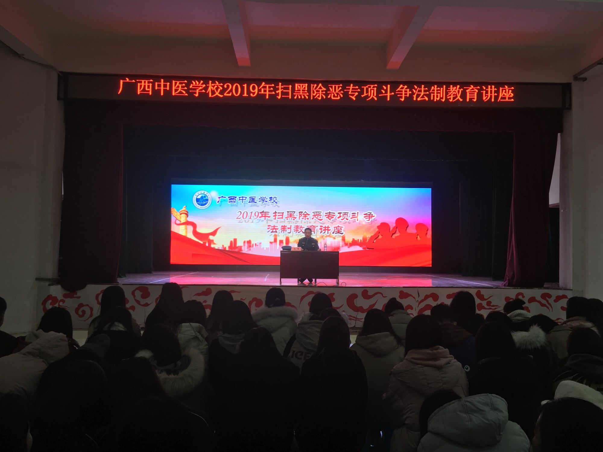 为了积极响应上级党委政府扫黑除恶专项斗争活动,进一步深化法制教育,增强师生自我安全防范意识,构建平安校园。1月2日晚,广西中医学校邀请了南宁市公安局北湖派出所高峰警官为该校800多名师生开展扫黑除恶专项斗争法制教育讲座。