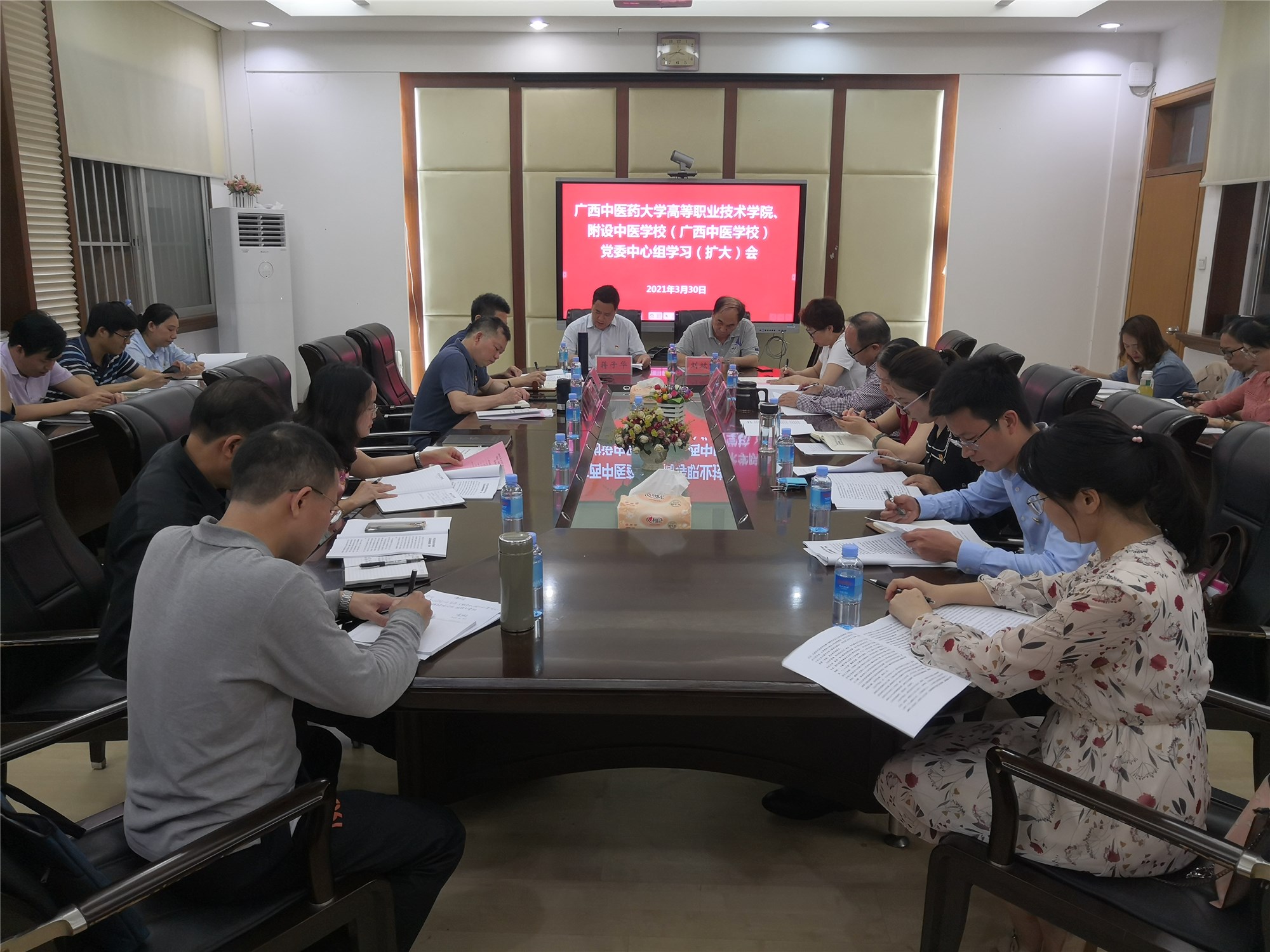 3月30日下午,高职院、附设中医学校党委在东葛校区一楼会议室召开理论学习中心组学习(扩大)会,就党史学习教育进行专题研讨,高职院、附设中医学校党委理论中心组成员参加学习。非党委理论中心组成员的其他中层干部列席会议。党委书记蒋子华主持会议。