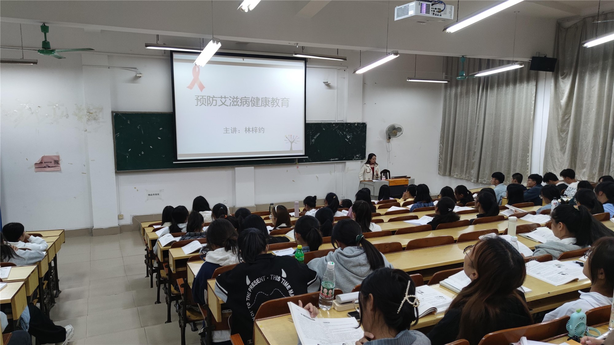 为强化艾滋病警示性宣传教育,提高大学生自我防范意识。高等职业技术学院全体新生辅导员:林梓约、吴静思、肖翔、于春秋、叶毅,在11月对 约600名新生分班次开展了大学生艾滋病防护知识讲座。