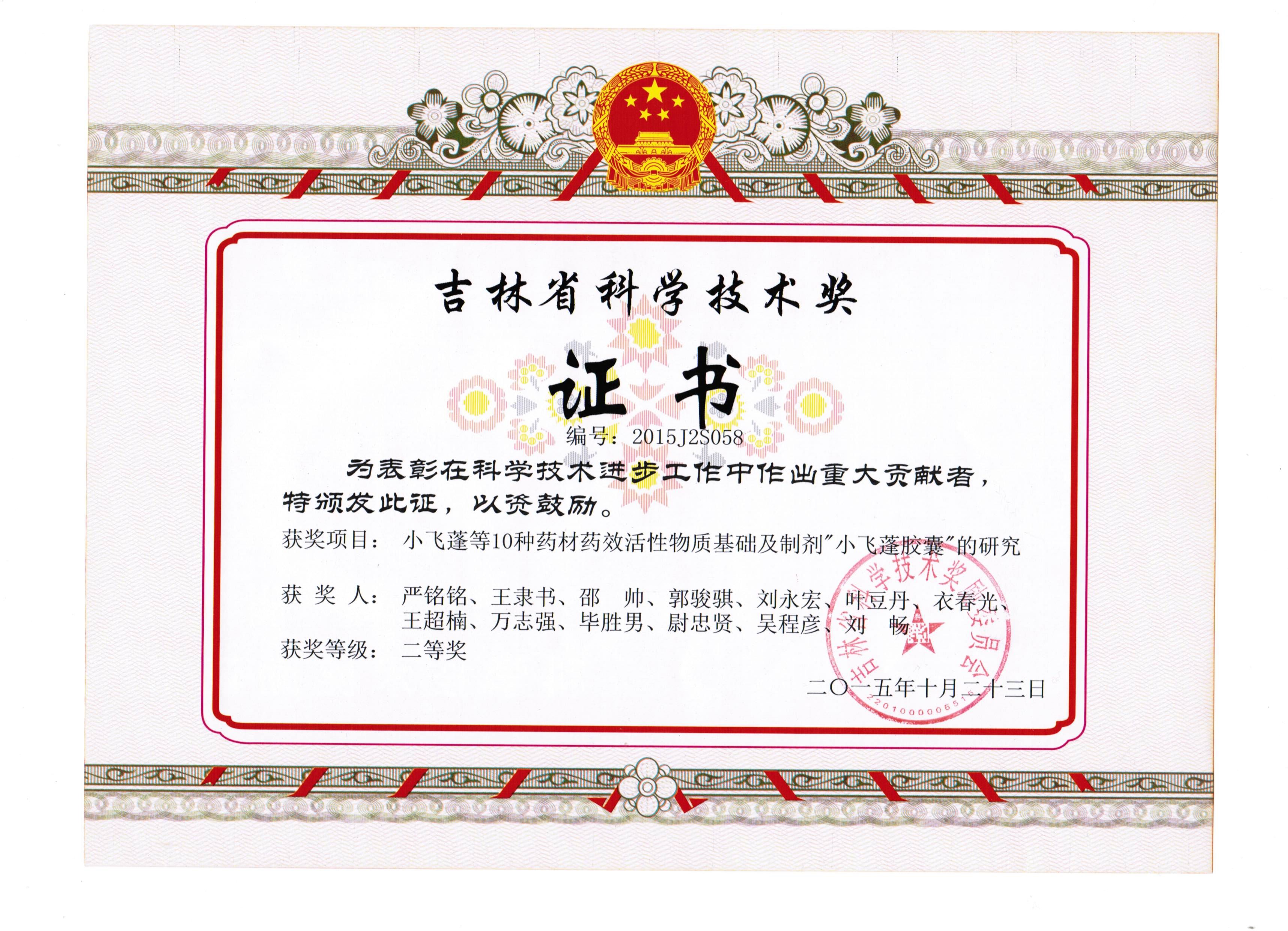 吉林省科技进步二等奖(刘永宏研究员,2015年)