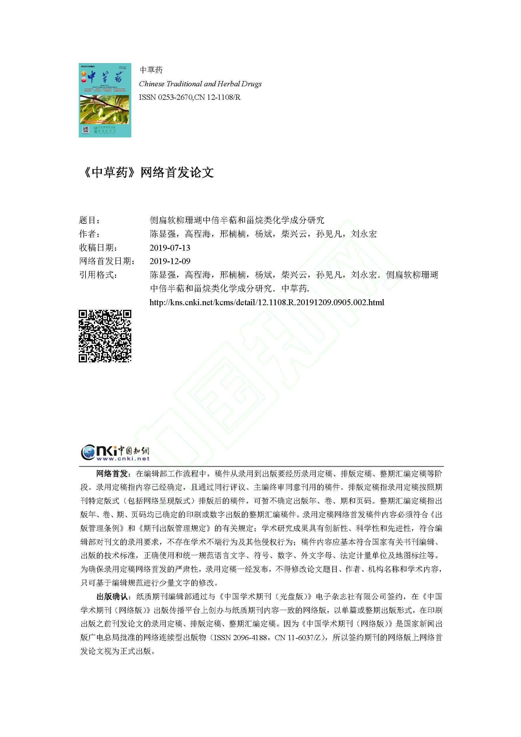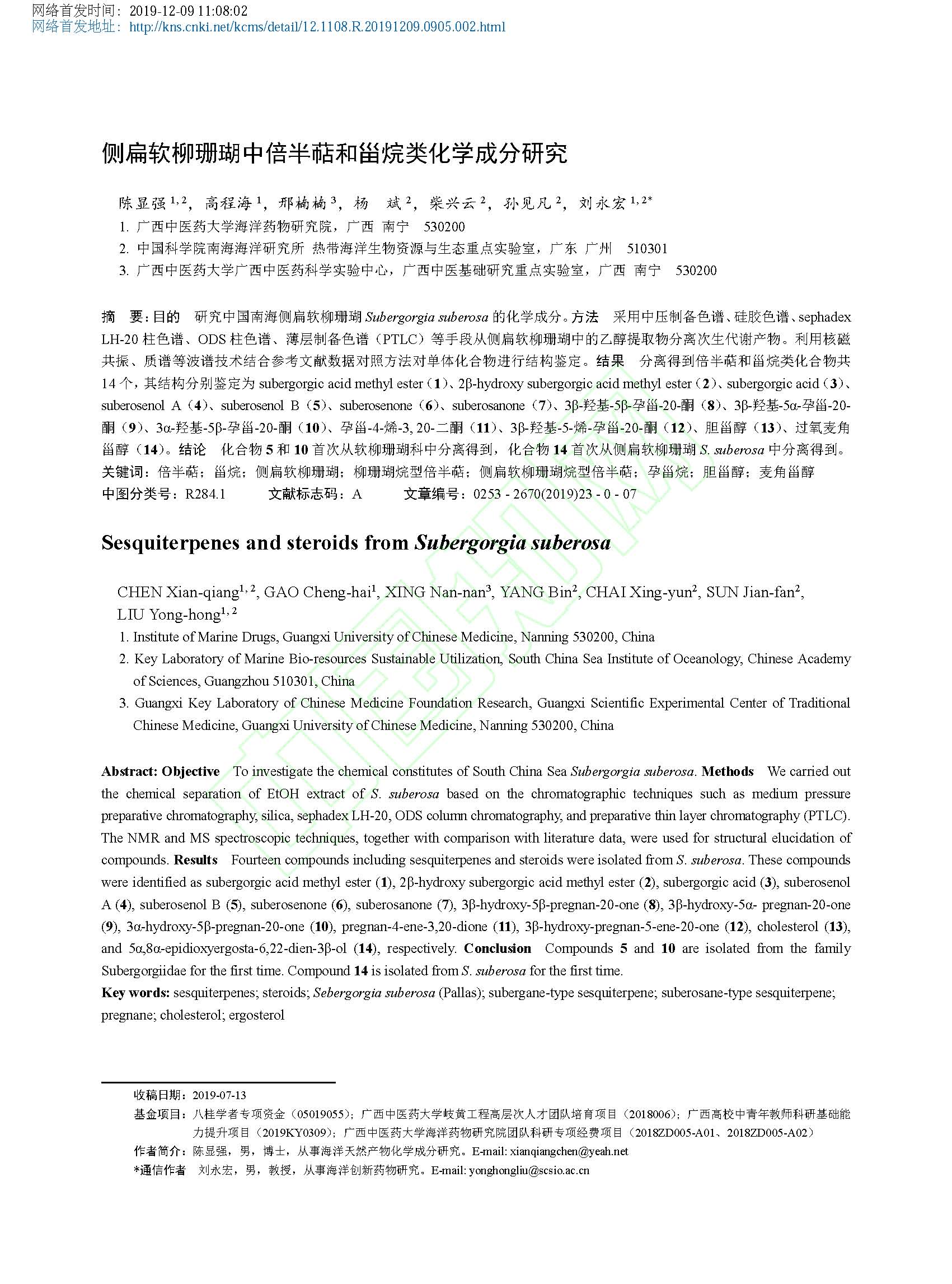 2019-侧扁软柳珊瑚中倍半萜和甾烷类化学成分研究