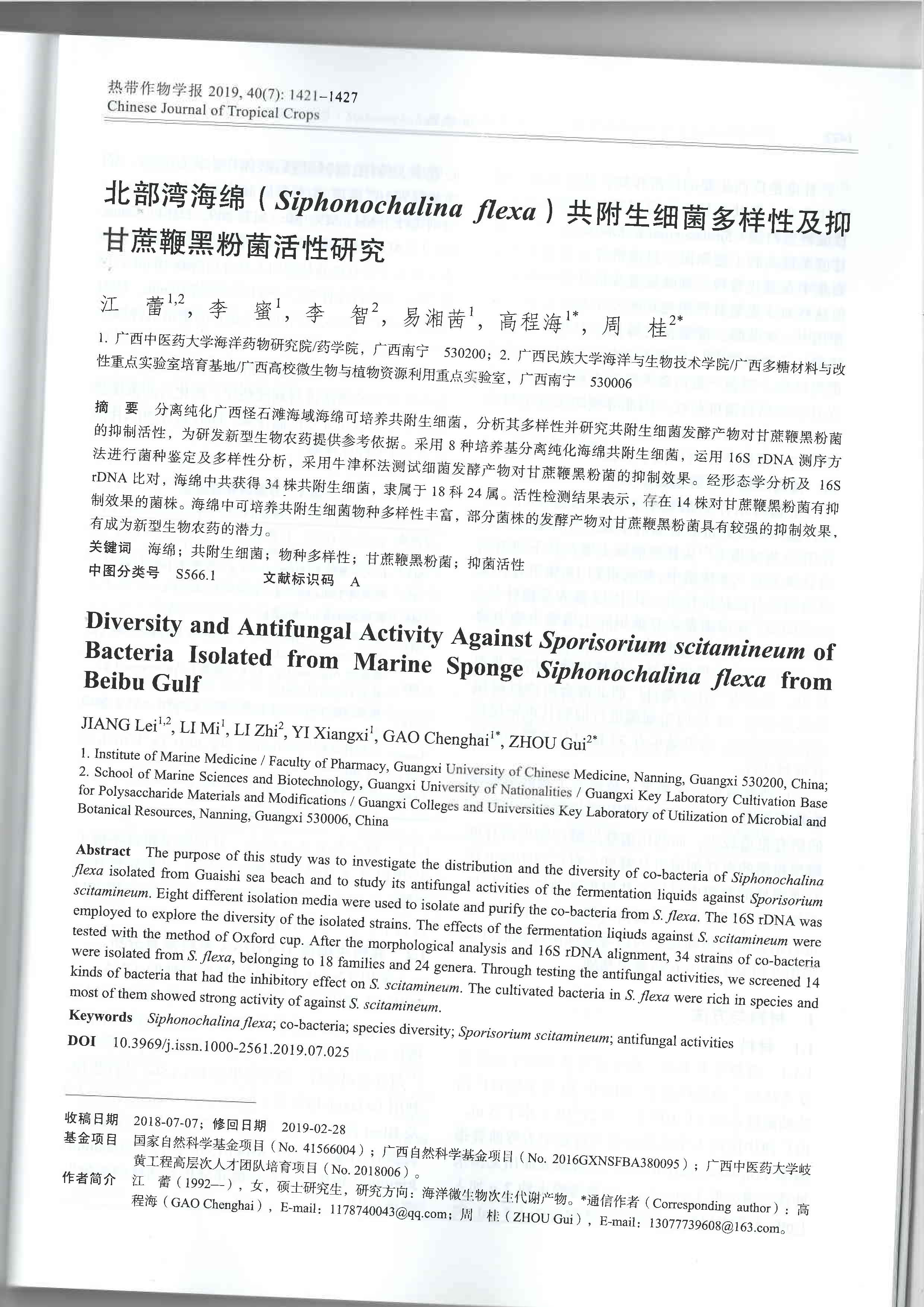 2019-北部湾海绵共附生细菌多样性及抑甘蔗鞭黑粉菌活性研究
