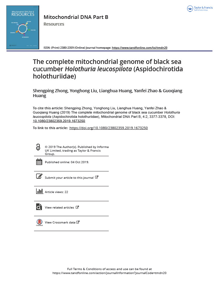 2019-The complete mitochondrial genome of black sea cucumber Holothuria leucospilota(Aspidochirotida holothuriidae) 发布时间:2020-10-20 15:07:03 浏览次数: 次 【字体:小 大】 分享到: 【打印正文】