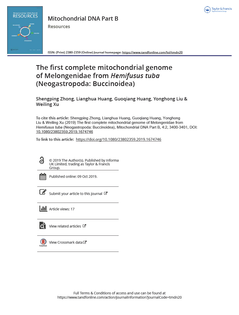2019-The first complete mitochondrial genome of Melongenidae from Hemifusus tuba Neogastropoda Buccinoidea 发布时间:2020-10-21 09:10:59 浏览次数: 次 【字体:小 大】 分享到: 【打印正文】