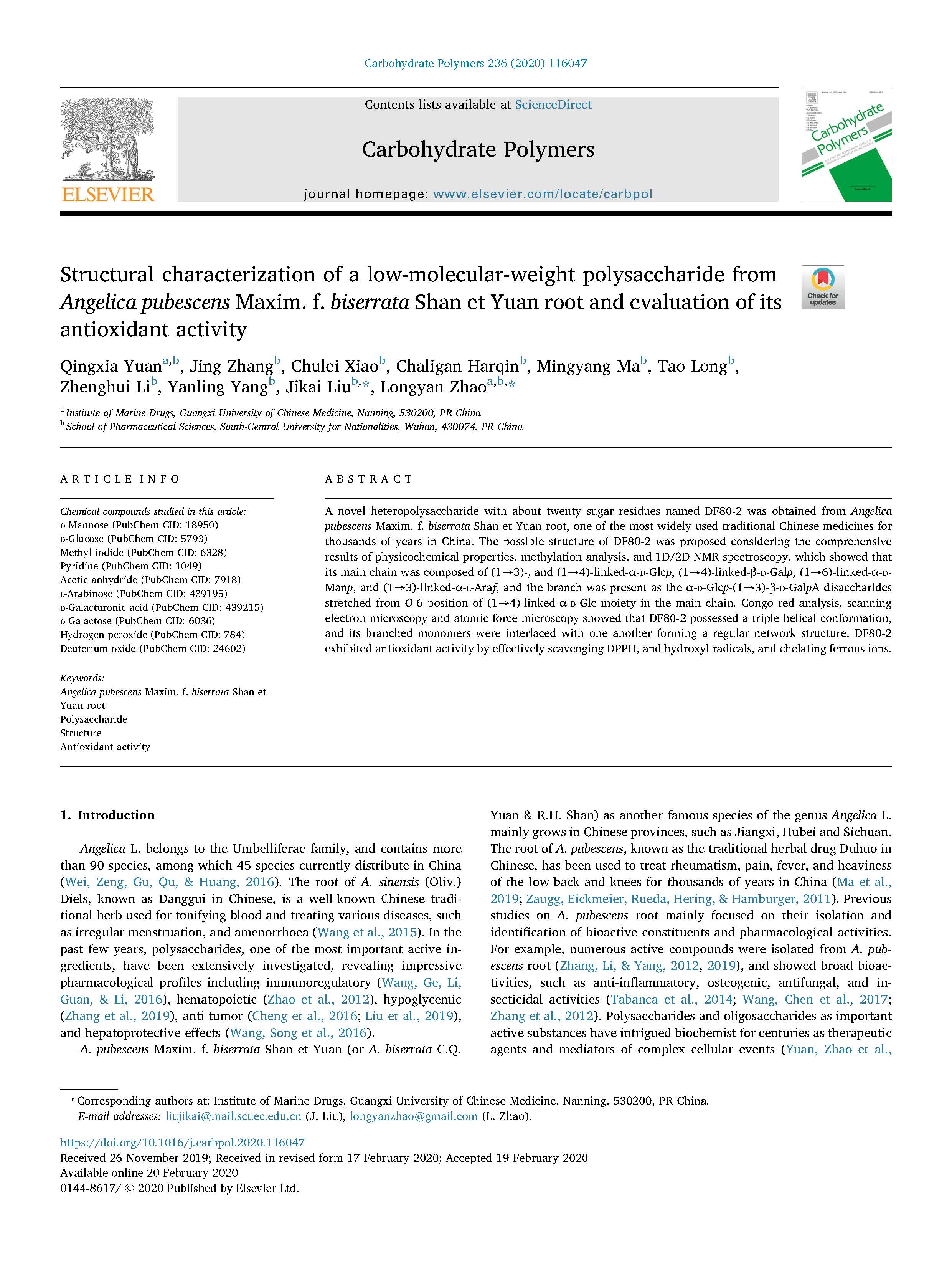 2020-Structural characterization of a low-molecular-weight polysaccharide from Angelica pubescens Maxim. f. biserrata Shan et Yuan root and evaluation of its antioxidant activity 发布时间:2020-10-21 15:32:59 浏览次数: 次 【字体:小 大】 分享到: 【打印正文】