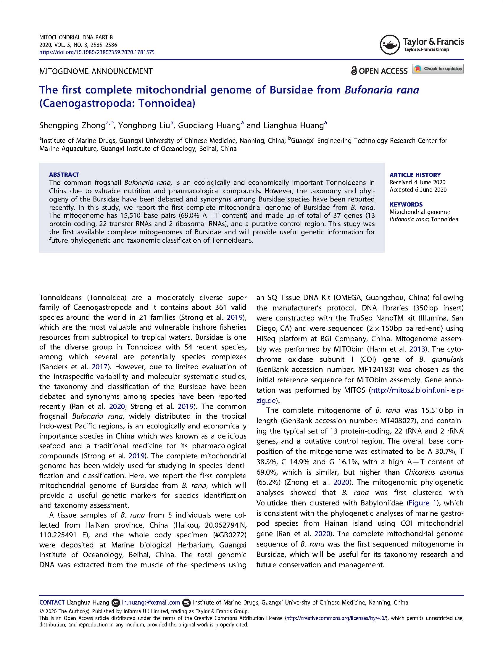 2020-The first complete mitochondrial genome of Bursidae from Bufonaria rana (Caenogastropoda :Tonnoidea) 发布时间:2020-10-21 16:53:29 浏览次数: 次 【字体:小 大】 分享到: 【打印正文】