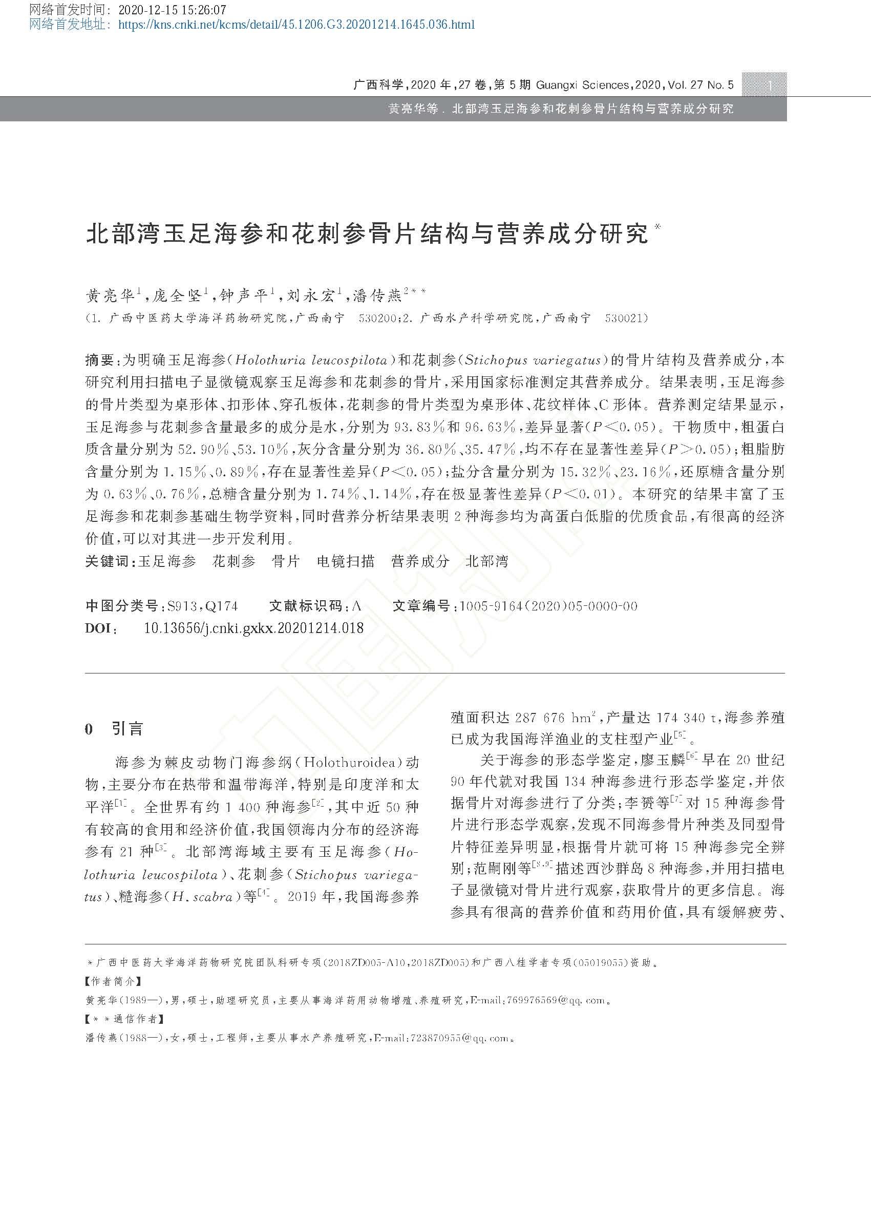 2020-北部湾玉足海参和花刺参骨片结构与营养成分研究