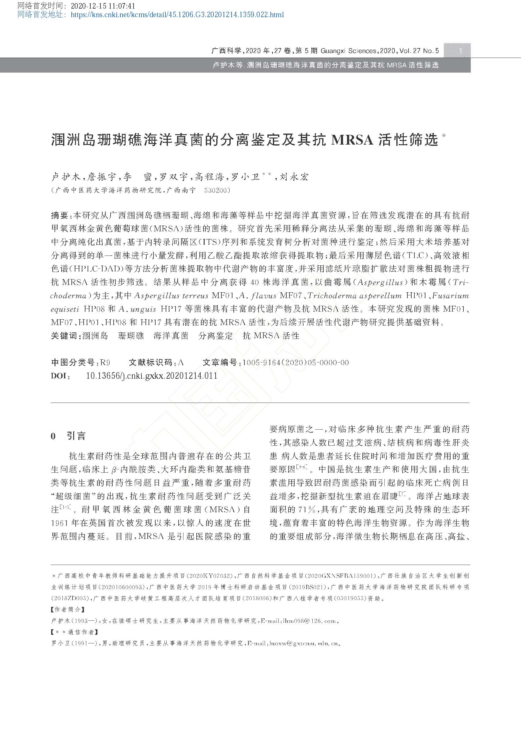 2020-涠洲岛珊瑚礁海洋真菌的分离鉴定及其抗MRSA活性筛选