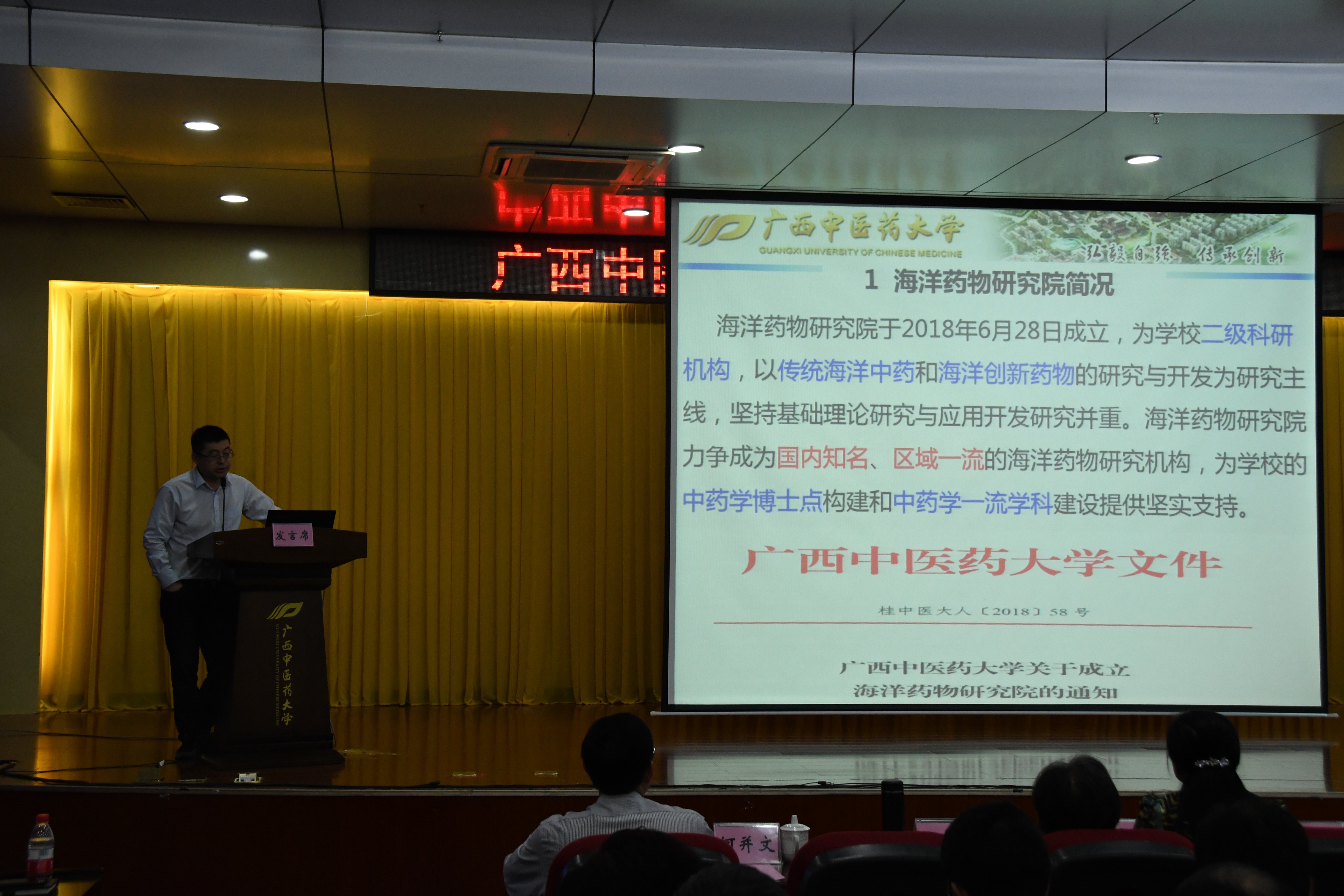 刘永宏院长代表我院做了海洋药物研究院工作进展报告,报告介绍了我院从成立至今的建设情况、代表性成果、对外合作情况及下一步建设情况。与会领导对刘永宏院长的成绩表示高度肯定,对海洋药物研究院的建设工作表示满意,希望刘永宏团队能够再接再厉,为学校的海洋药物学科,为广西海洋药物事业再创佳绩。