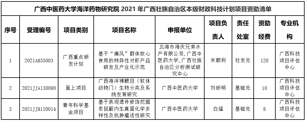 【喜讯】海洋药物研究院米顺利、刘昕明、白猛三位老师获2021年广西壮族自治区本级财政科技计划项目资助