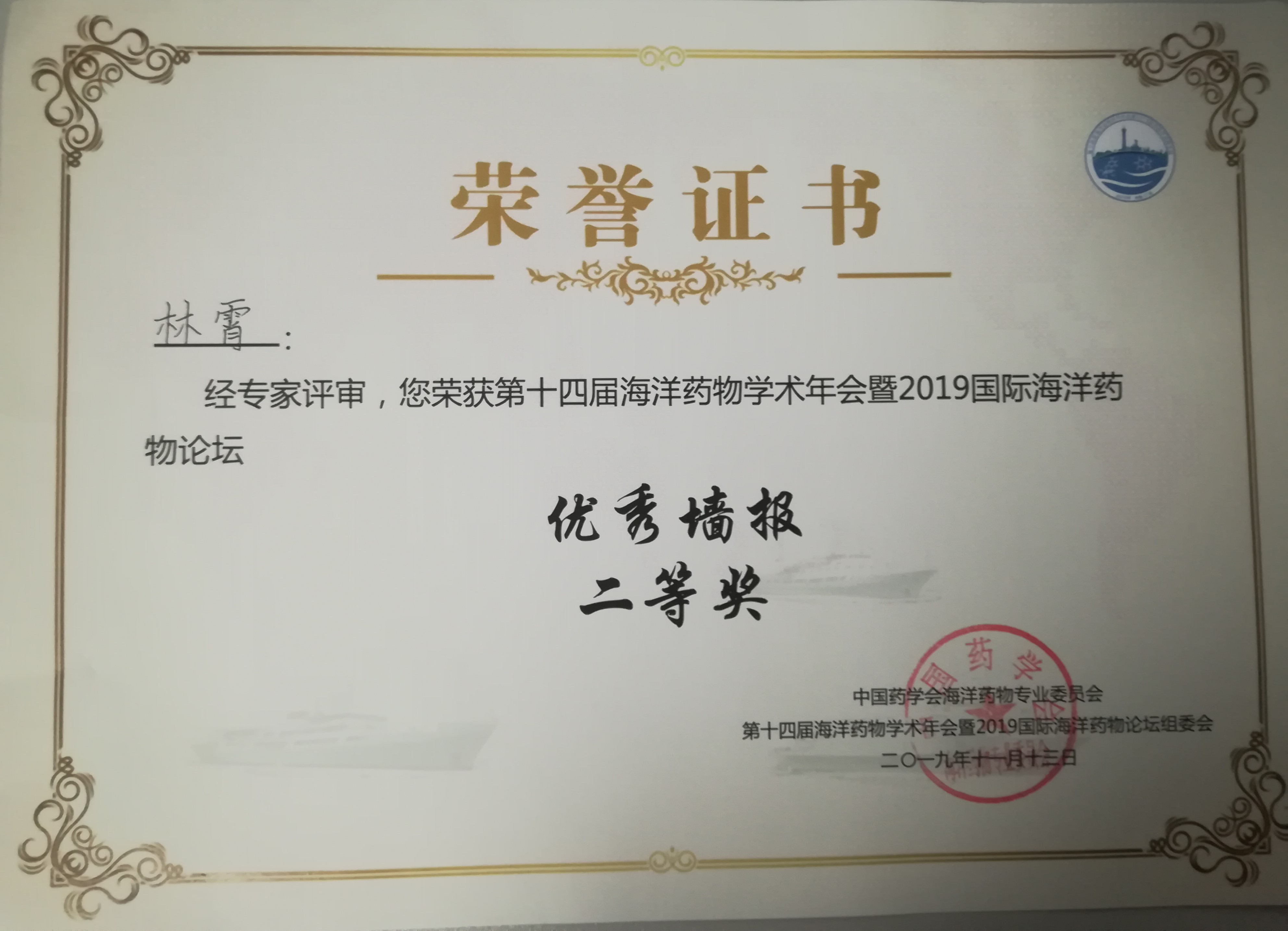 13日下午进行的墙报评选,我院林霄副研究员题为“Structure elucidation and cytotoxicity of neoantimycin derivatives”荣获优秀墙报二等奖;鸭脖易湘茜教授题为“The new ameliorates cognitive impairment secondary metabolite from Avicennia marina fruit”的墙报获优秀墙报三等奖,鞠建华研究员主持公布墙报获奖名单并为获奖者颁奖。